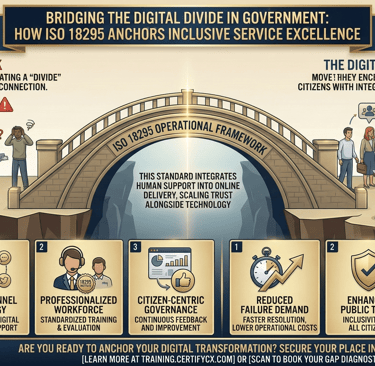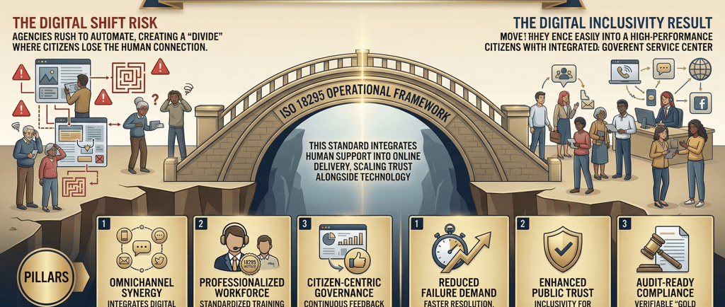 A primary risk in digital government initiatives is the "digital divide." When citizens encounter friction in online services without adequate support, they are effectively left behind. ISO 18295 mitigates this risk by emphasizing the synergy between human support and technological advancement.