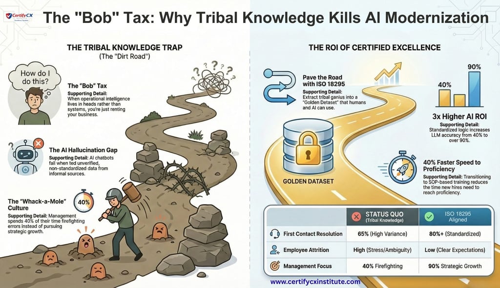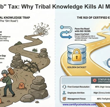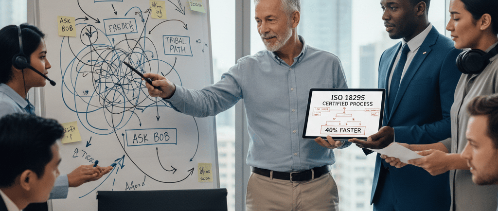 Discover the risks of relying on 'tribal knowledge' in contact centers. Learn how to transition to certified operational intelligence with ISO 18295 contact center standards, reduce training time by 40%, and prepare for an AI-driven future.