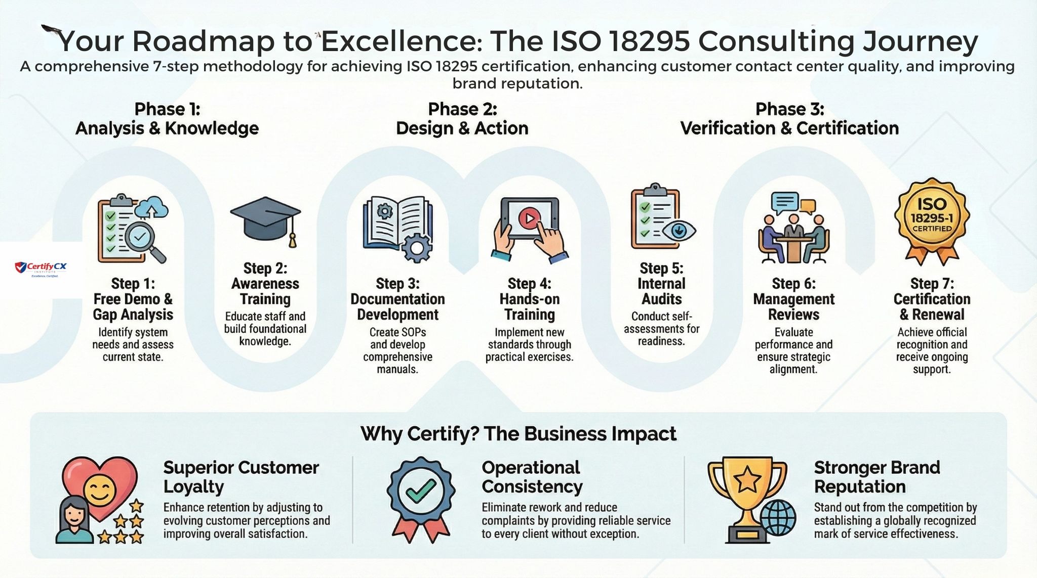 CertifyCX Institute helps government and healthcare contact centers establish documented governance, controlled service processes, competent workforces, and measurable performance—the core requirements of ISO 18295—before technology, audits, or oversight expose operational gaps.